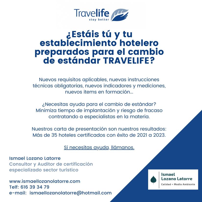 Si necesitas ayuda para la autoevaluación o quieres que la lleve a cabo personal especializado, que no solo cumpla el trámite, sino que enriquezca tu sistema e implante mejoras, estamos a tu entera disposición. Más de 15 años de experiencia en TRAVELIFE y más de 35 hoteles certificados con éxito en Canarias nos avalan.